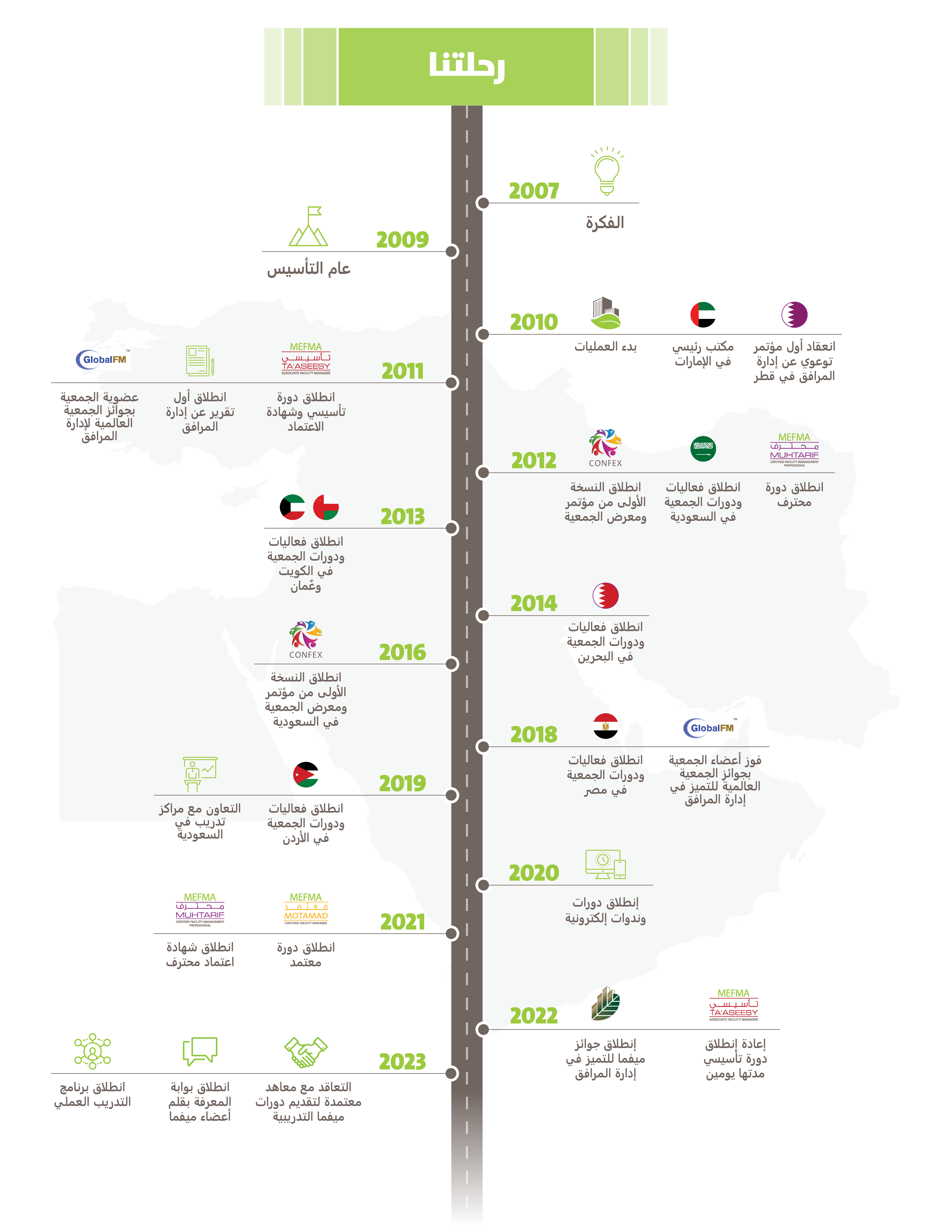 يقع مقر ميفما الرئيسي في دبي – الإمارات العربية المتحدة، وتشمل انشطتها دول مجلس التعاون الخليجي ومنطقة الشرق الأوسط. تأسست ميفما في عام 2009 كمنظمة مهنية غير ربحية ضمن إطار مركز دبي للهيئات الإقتصادية والمهنية التي تأسست من خلال غرفة تجارة وصناعة دبي، مكتب فعاليات دبي للأعمال (جزء من دائرة السياحة والتسويق التجاري) ومركز دبي التجاري العالمي. بالإضافة لذلك، ميفما عضو مسجل في الجمعية العالمية لإدارة المرافق