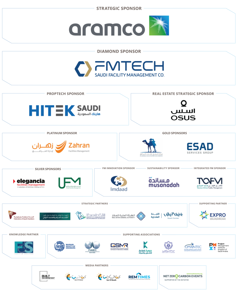 In the presence of H.E. Ihab Hashani – Vice Minister, Ministry of Municipal Rural Affairs and Housing Opening Remarks o Jamal Lootah – MEFMA President & Group CEO, Imdaad o Mohammed Alduraibi – MEFMA Board Member (KSA) & Managing Director, Oud Real Estate Welcome Address o Abdullah Saud Al-Hammad – CEO, Real Estate General Authority o Mohammed Bin Abdullah Almarshad – First Vice Chairman of Board of Directors, Riyadh Chamber & Chairman National Real Estate Commission, Federation of Saudi Chambers o Ahmed Balkheyour – Executive Director (Engineering & Contracts Support), Expenditure and Projects Efficiency Authority (EXPRO) o Adel Ibrahim Al Roeshedy – CEO, The Saudi Facility Management Company FMTECH Honoring of Sponsors & Strategic Partners |